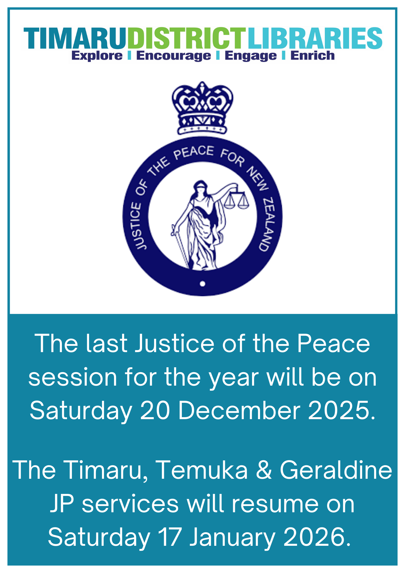 The Justice of the Peace sessions at Timaru, Temuka and Geraldine libraries have now concluded for 2025. They will recommence on Saturday, 17 January 2026.